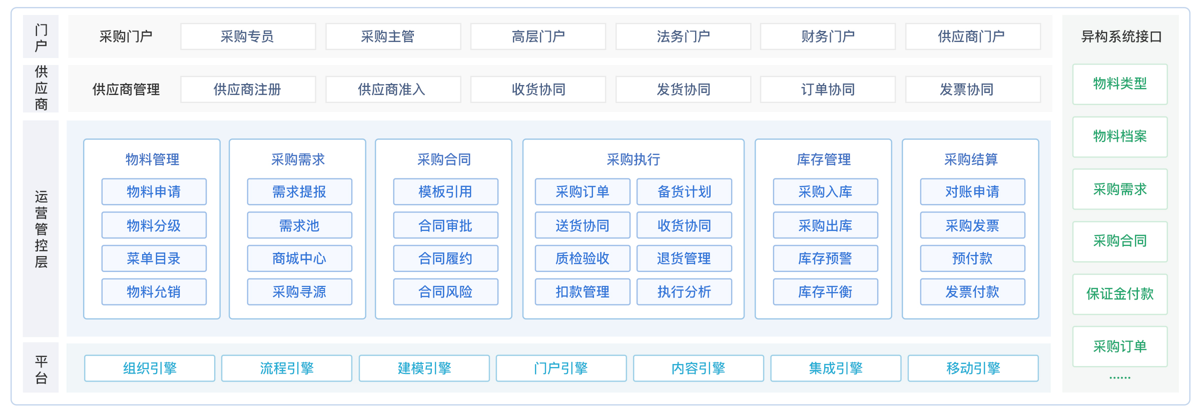 信息整合,协同高效;采购质优价廉,采购线上管理;系统要求易用、好用,导入成本低。