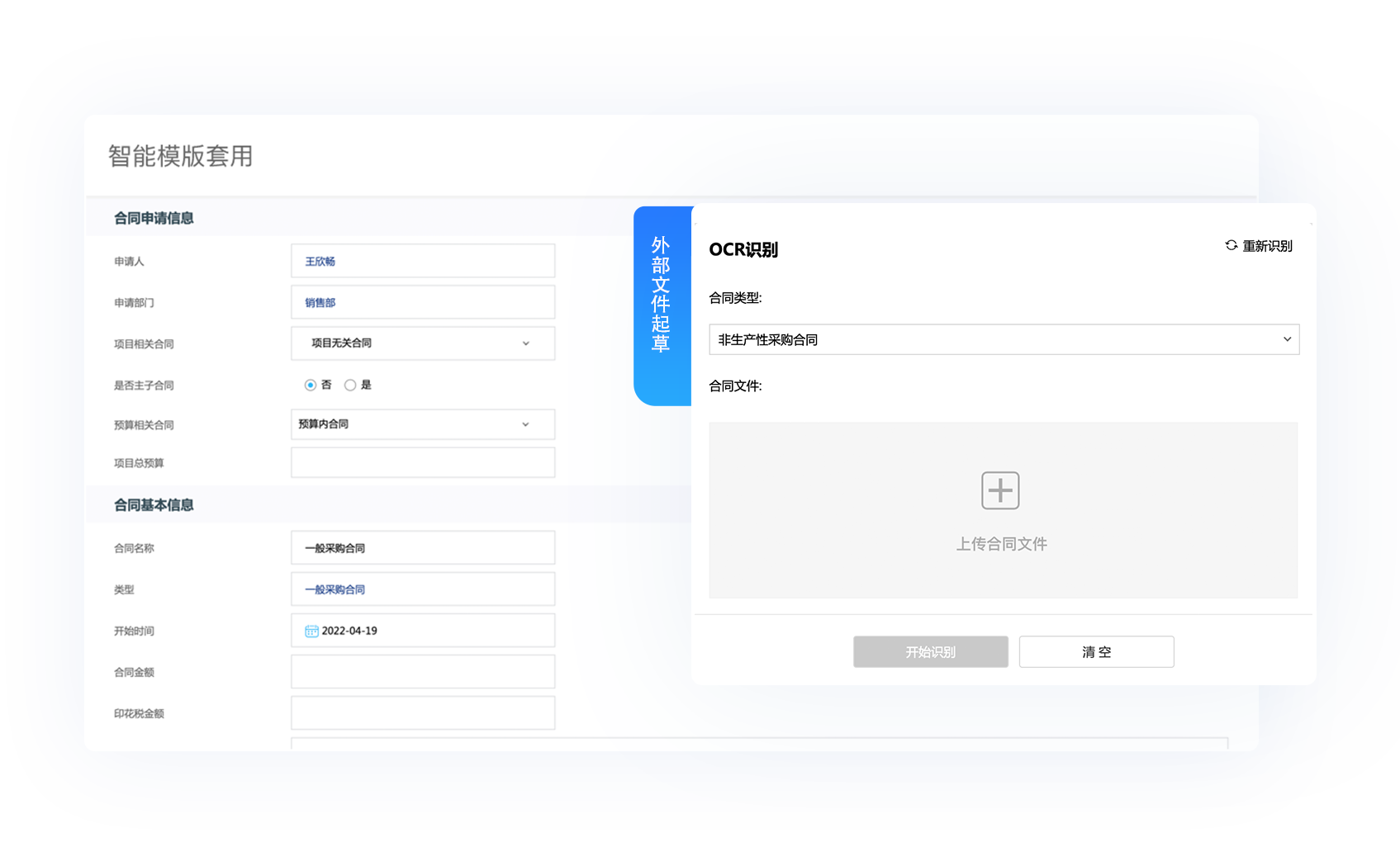 京桥通对于各类采购合同,支持预置多种合同智能模板直接套用,实现表单直接写入模板;同时支持智能识别外部协同的合同文件,抓取合同关键要素自动完成表单填写,实现从文本到表单要素的自动转换。