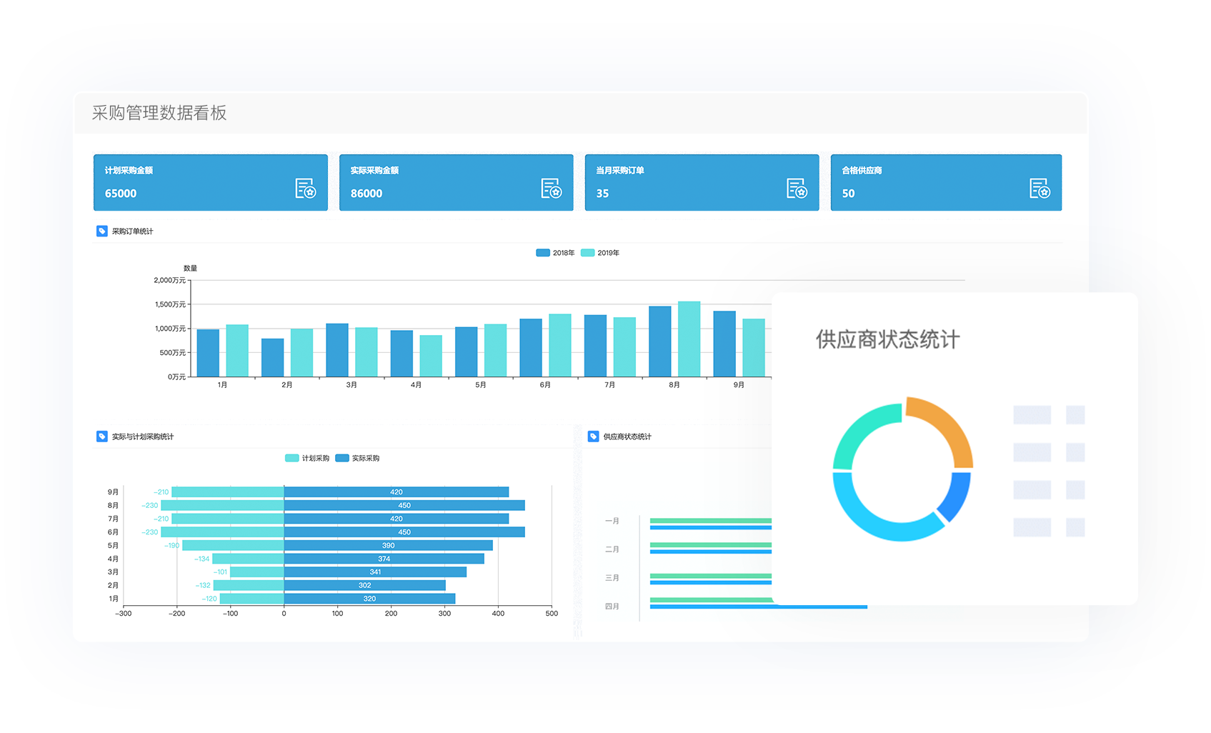 京桥通采购门户中,针对采购业务中的各业务单元不同权限和关注点,分别展现了供应商及历史交易,采购需求,招标进程,合同账务、法务条款以及采购订单处理各节点的相关信息以及汇总数据。