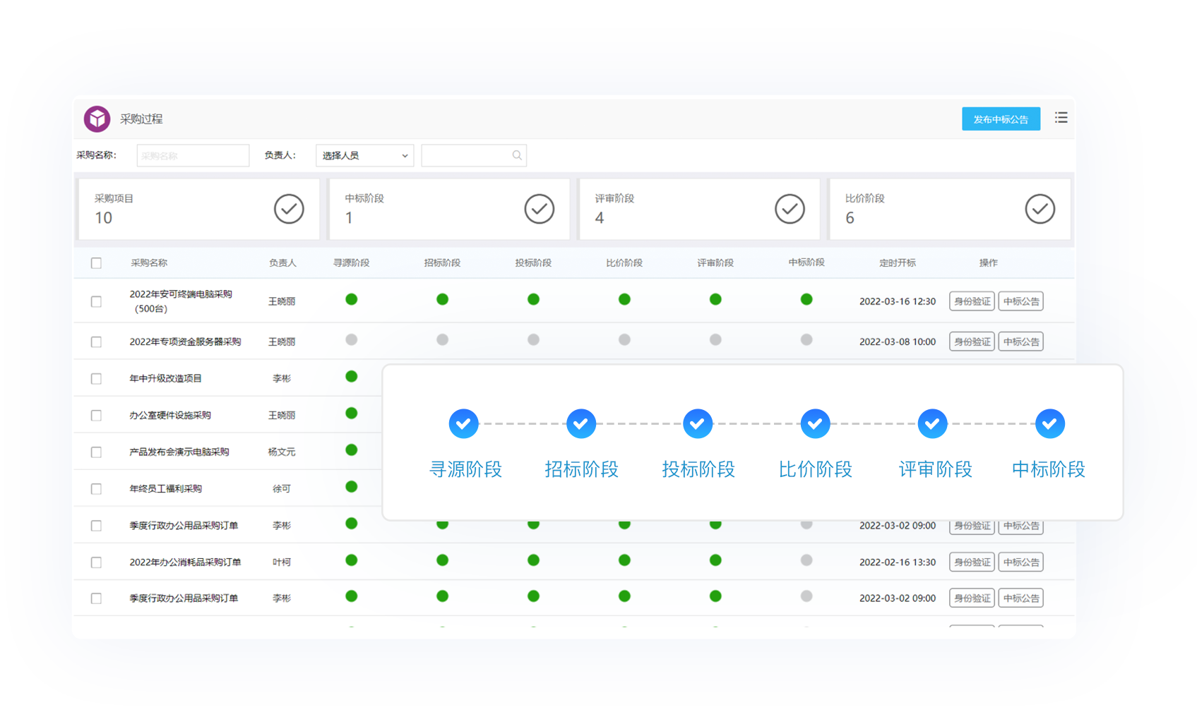 京桥通的招投标管理支持数智化的招投标过程管理,多项目的寻源进程一览,具体项目的过程穿透操作,从招标发起,到招标现场执行,支持多种密码,自动多种开标方式,支持多种寻源方式,实现招投标文件电子化。